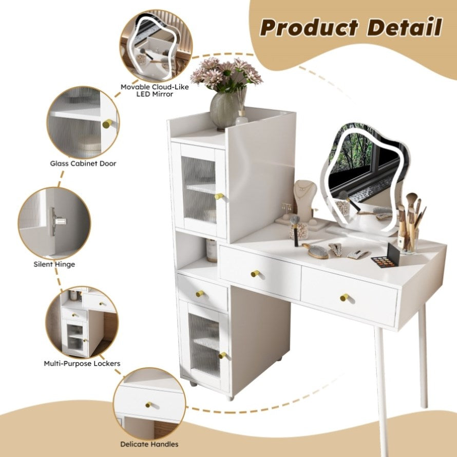 Vanity mirror with light desk: This vanity desk features a large LED mirror providing clearer lighting during skin care makeup. It has 3 adjustable color modes (warm yellow, warm white, cool white), You can change the color mode by pressing the touch switch