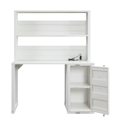 The storage base features a door with two interior compartments and one metal shelf, providing concealed and organized storage for office supplies and other essentials