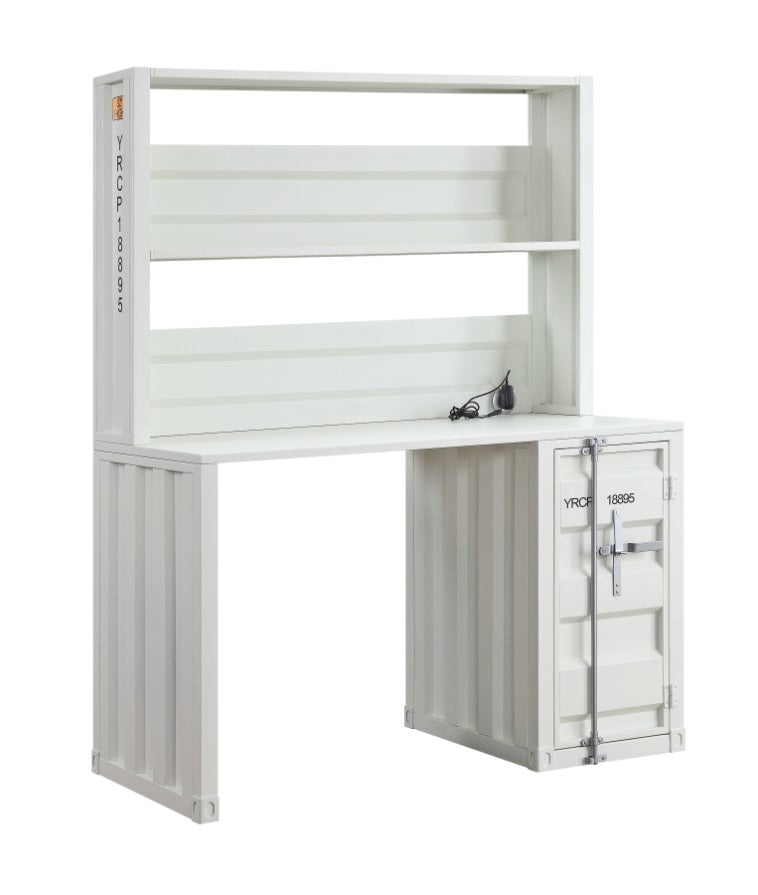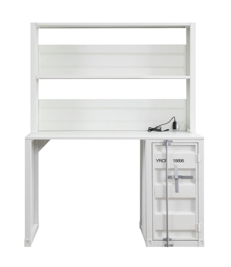 This desk with hutch provides an integrated workspace with additional storage, maximizing functionality and organization in a single unit. The storage hutch includes one open compartment with a fixed metal shelf, offering a dedicated space for displaying or storing books and other items.