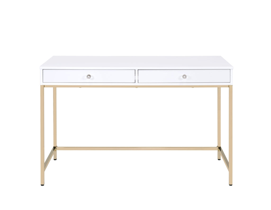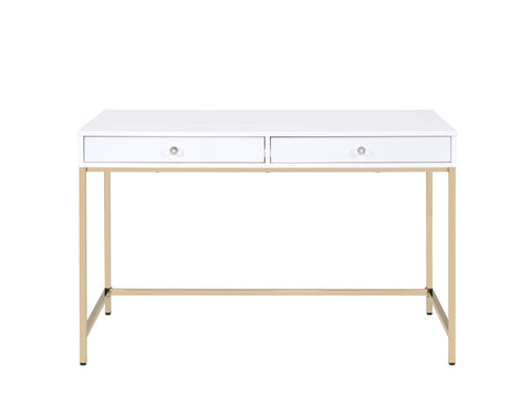 Enjoy the contemporary design of the vanity desk while completing your work in style. Featuring a high gloss finish with a gold metal base, this practical yet fashionable desk offers ample surface room and two storage drawers for your office supplies or accessories.