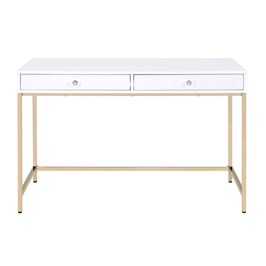 This contemporary writing desk features a white high gloss finish and a gold metal base that add elegance and style to any home office or study room