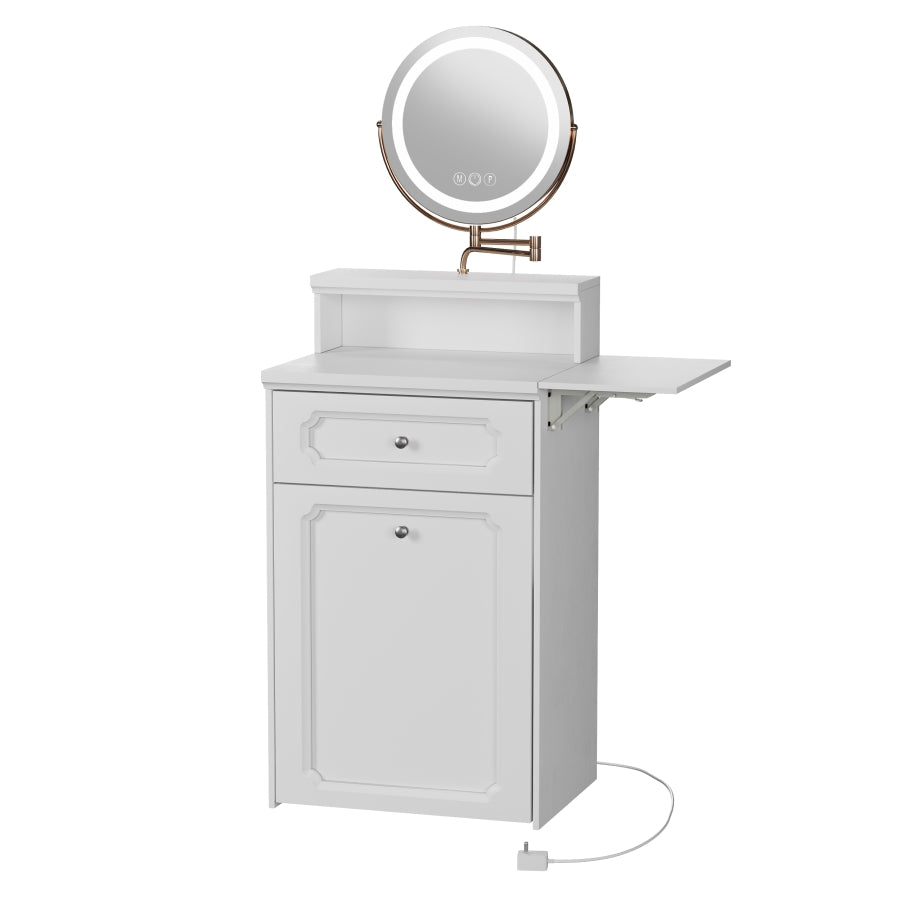 Foldable Extension PanelThe stylish makeup vanity table is perfect for small bedrooms or apartments, serving as both a dressing table and a writing desk. Its foldable side panel provides extra space for your daily beauty and work needs, making it an ideal choice for limited spaces.Elegant one-piece cabinet door design, made from high-quality 15mm full frame board, heavy-duty handles, and hardware fittings, ensuring stability and durability for long-lasting use.