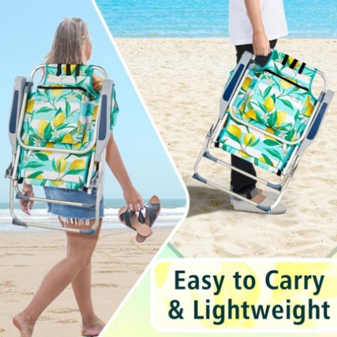 Get comfortable with this Folding beach Chair. It is an ideal solution for sitting and relaxing in comfort during outdoor activities. It is also a must-have for a sporting event, a picnic, a camping trip or even just to the backyard. The aluminum frame is not only light-weight, but also offers even greater sturdiness and stability to make it stand up to various conditions. In addition, the adjustable back with 5 positions to create better sitting feeling, and the extra storage space such as pouches on the back and side cup holder allow you to keeps the necessities right by your side. The beach chair is light-weight and easy to move so that it fits easily inside most vehicles for fast transport wherever you need.