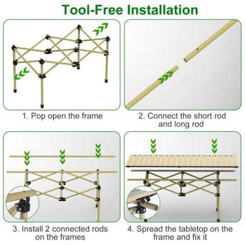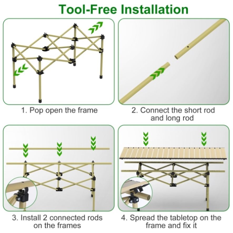 • Quickly Assemble & Disassemble: Collapsible frame and roll-up tabletop require no extra tools during installation. The whole assembly process only takes a few minutes. All you need to do is to pop open the frame, attach tubes and tabletop, and prepare your table.