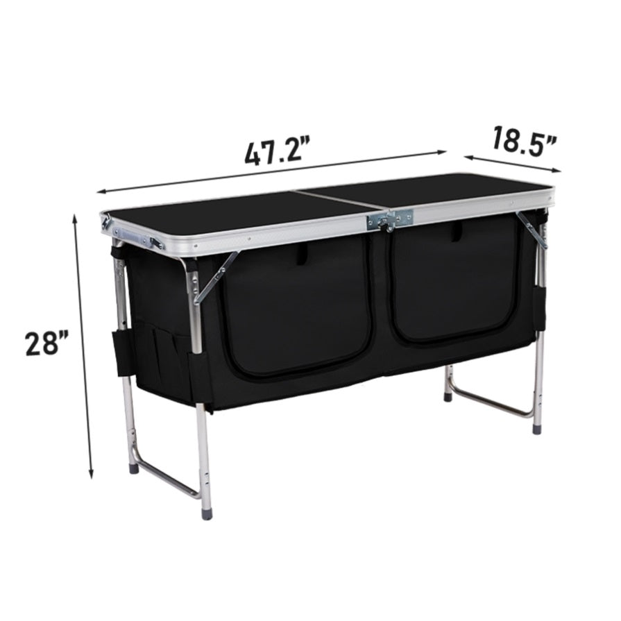 1. Extra-Large Enclosed Storage: Includes 2 spacious compartments that are perfect for storing food, beverages, utensils, or cooking gear safely off the ground. The covered design protects your items from dust, bugs, and outdoor elements, ensuring everything stays clean and ready to use. Plus, the detachable storage bag makes packing, carrying, and cleaning a breeze.