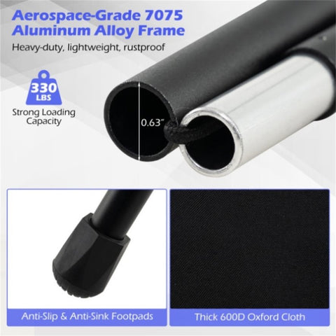 ● Reliable and Sturdy Construction: Built with an aerospace-grade 7075 aluminum alloy frame that is both lightweight and rustproof, complete with 0.63"/16 mm thick poles and thick 600D oxford seat, the portable camping chair offers a robust foundation, built to last. For added stability on various surfaces, it features anti-slip and anti-sink footpads.