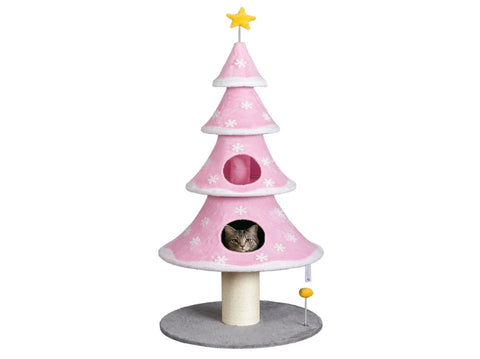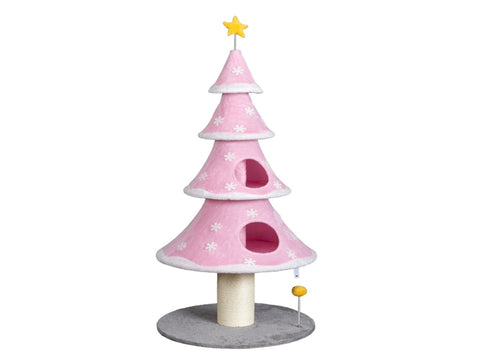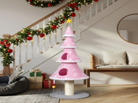 Bring a festive twist to your cat's playground with the 59in Large Tall Christmas Tree Cat Tower. This unique cat tree not only serves as a fun, multi-level activity center for your feline friend but also doubles as a decorative holiday piece. With two cozy cat houses at different levels, each equipped with built-in openings, your cat can explore, climb, and rest in ultimate comfort. Covered in soft fleece and featuring a fun teaser toy at the base, this stable cat tower ensures endless entertainment and relaxation for indoor cats.