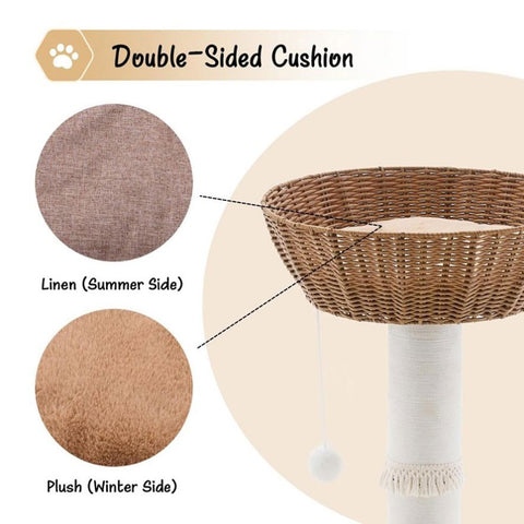 2-Sided Cushion for All-Season Comfort: The top nest of the cat tree is paired with a 2-sided cushion, made of soft plush fleece on one side and breathable linen on the other. In winter, the plush side delivers warm coziness to keep your cat from the cold; in summer, the linen side promotes air flow to prevent stuffiness. It ensures your feline gets a comfy resting spot in every season.