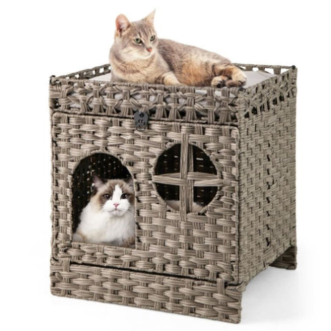 ● Easy Maintenance: The structure of the cat condo furniture is foldable, making setup a breeze without any need for tools. The inner dimensions of 20.5" x 16.5" x 15" (L x W x H) accommodate most types of litter boxes. The rattan cat house is recommended for small and medium sized cats.