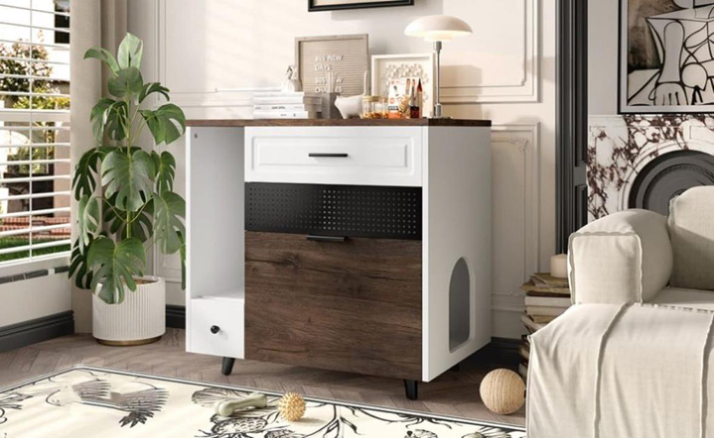 Ample Storage Space: Two built-in drawers keep litter scoops, toys, treats, magazines, and other essentials neatly tucked away. The spacious tabletop provides a stylish display area for photo frames, potted plants, cat treats, and more.