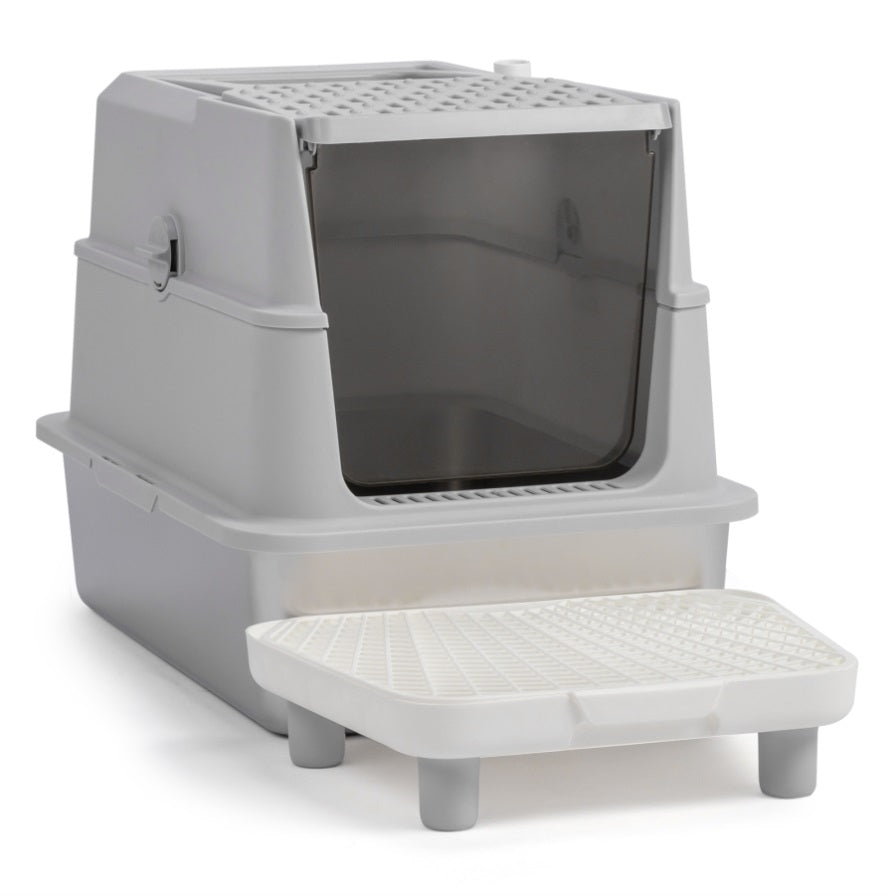 Give your cats the space and cleanliness they deserve with this extra large stainless steel cat litter box. Designed with durability and functionality in mind, this covered litter box features a spacious interior, dual entry options, and a smooth non-stick surface for hassle-free cleaning. The semi-enclosed lid helps control odor and improves ventilation, while the stainless steel base resists staining and lasts significantly longer than plastic alternatives. Complete with a litter scoop and filter pedal that reduces litter tracking, this all-in-one solution is perfect for large cats or multi-cat households.