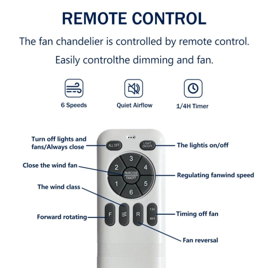 The ceiling fan is equipped with a remote control for your convenience. There are 6 speeds that can be adjusted to meet your different needs and maintain the ideal comfort level. And it has timing function, so you can set 2 different times (1 hours / 4 hours) as needed.