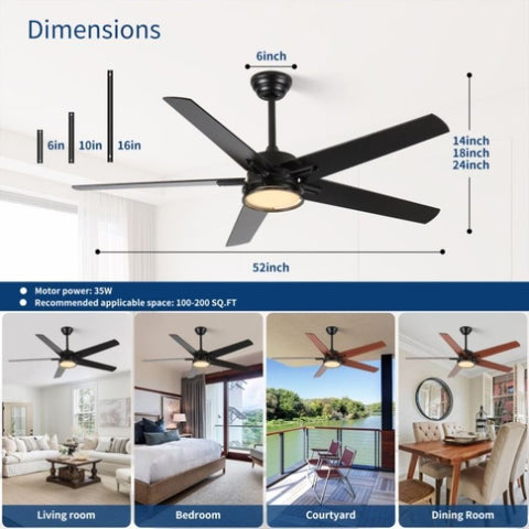 52in Ceiling Fans with Lights, Black Modern Ceiling Fan with Remote, Farmhouse Indoor Ceiling Fan , W2878P333282