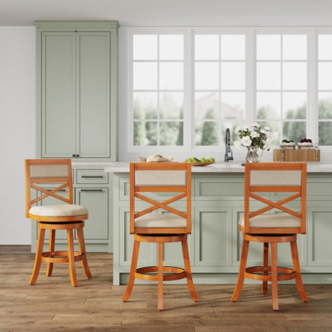 24" Counter Height X-Back Swivel Stool, Natural, Beige Fabric