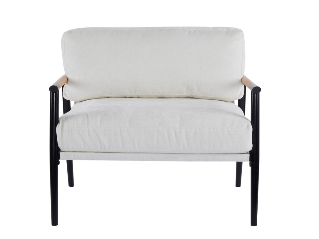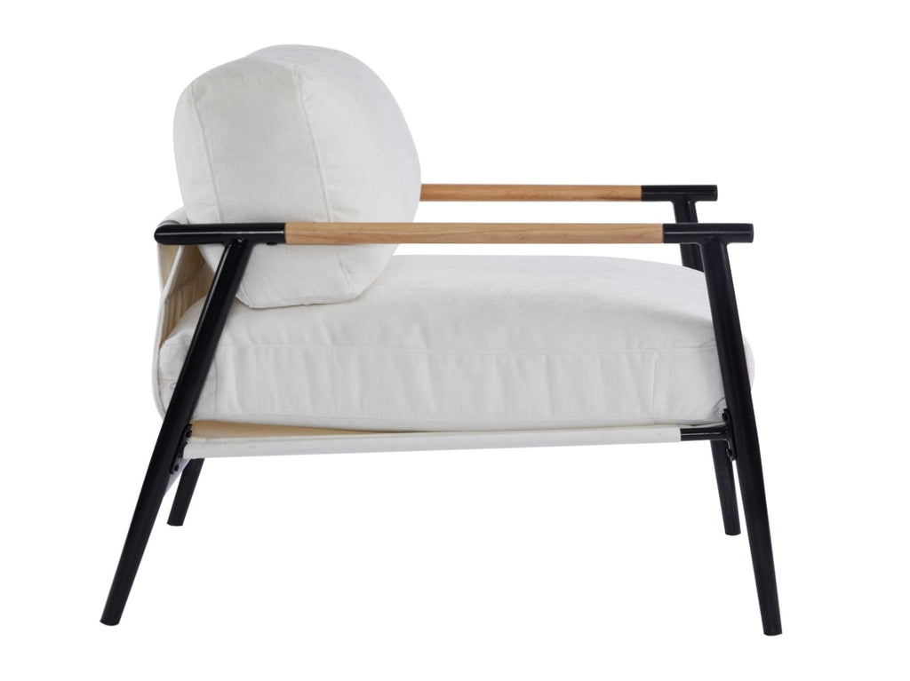 Contemporary Elegance: This modern armchair combines sleek lines with a minimalist design, making it the perfect addition to any contemporary living space. The black metal frame paired with natural wood armrests creates a stylish contrast, adding a touch of sophistication to your décor.