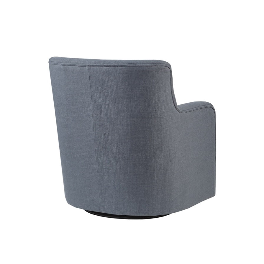 The Adele Swivel Chair will add a touch of style and comfort to your home. Upholstered in a blue fabric, this swivel chair features round arms and a button tufted back to create a charming transitional look. A metal swivel base allows the chair to rotate 360 degrees. With a loose seat providing soft comfort, this swivel chair adds style to your living room decor. No assembly required.