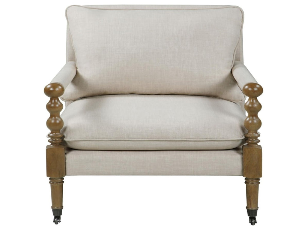 Add a touch of style and comfort to your living space with Beatrice Beige Wooden Accent Chair. The plush pillows and sturdy wooden frame ensure a comfortable, inviting seating experience. The chair's curved wood designs add an intriguing touch of style, while built-in caster wheels on the front make it easy to move from place to place.