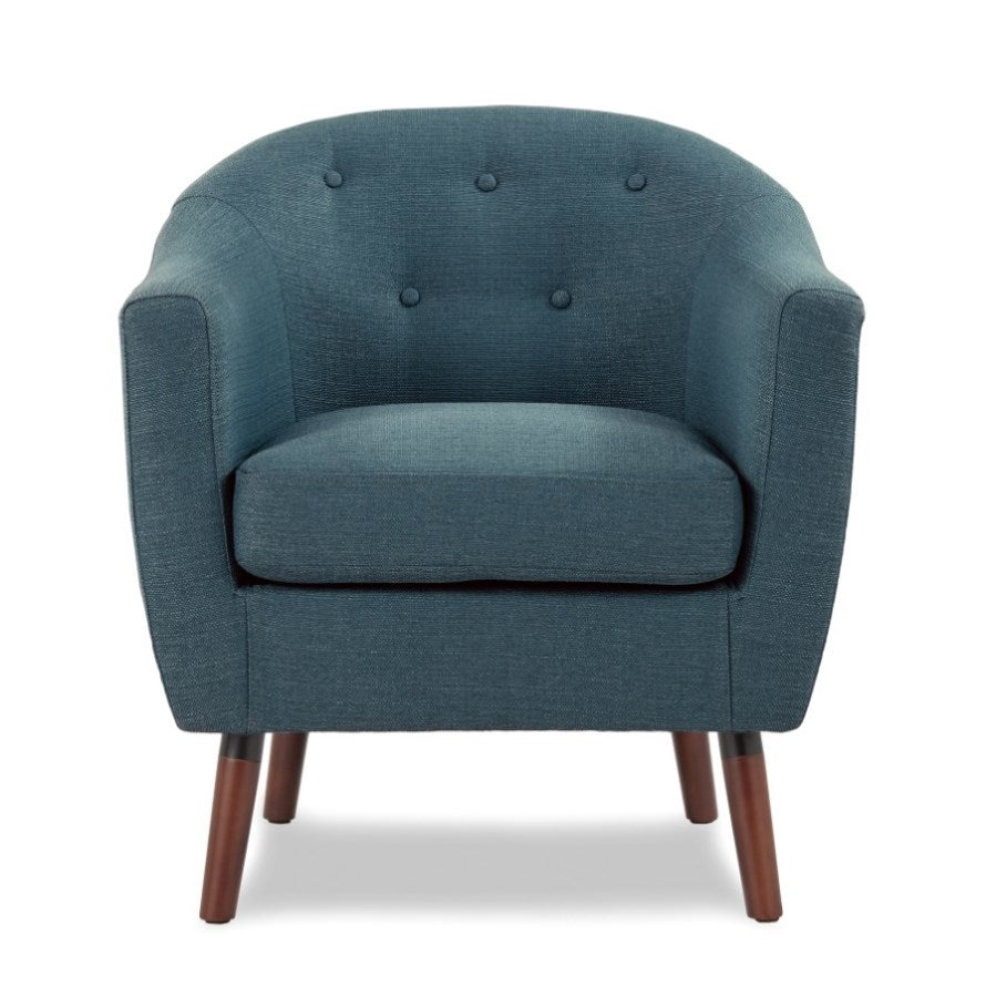 Retro lines need not stay in the past with the mid-century inspired lines of the Lucille Collection. The blue fabric chair features a contoured chair back with button-tufted accenting and stylishly appointed cherry finished wood legs, providing a look that shows your classic personal style. Additional fabric offerings that range from neutral to bold – gray, beige and orange.