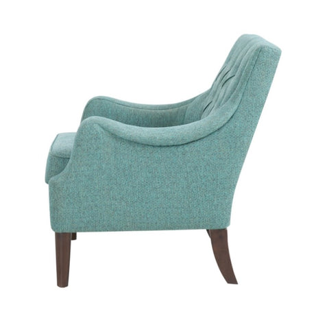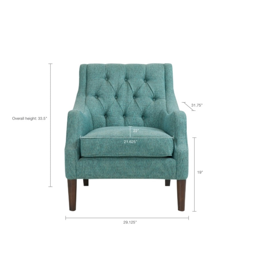Elevate your living room with the vintage-inspired style of the Madison Park Qwen Button Tufted Accent Chair. This accent chair is upholstered in a soft, rich fabric that features a button tufted back to create an elegant transitional look. The solid wood legs flaunt the espresso finish that complements the upholstery. With its soft removable seat cushion, this upholstered accent chair adds the perfect combination of comfort and style to your home decor. Leg assembly is required.