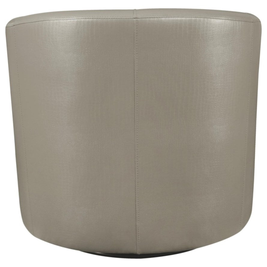 You'll love the calming barrel-back design of this faux leather contemporary accent chair. It will delight you with its charming silhouette and rich faux leather coupled with sloping armrests and swivel capability that makes this chair perfect for any contemporary space.