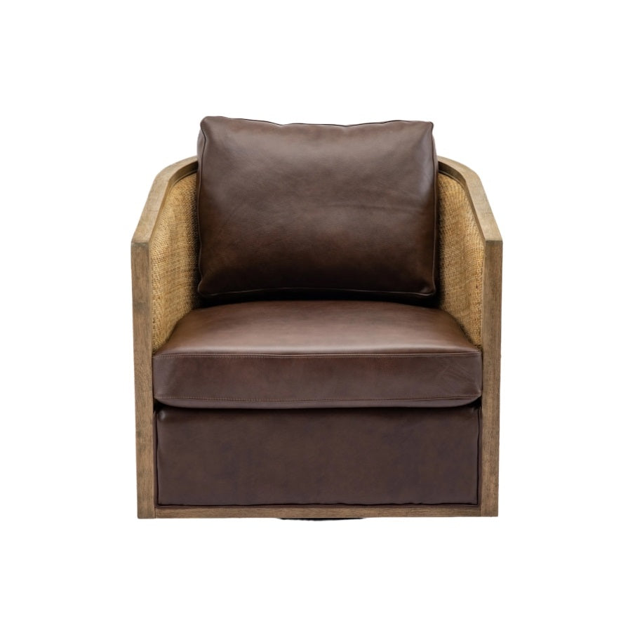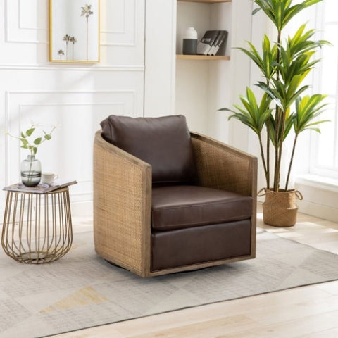The accent chair features rattan wrapped around the frame of the chair for a unique charm to enhance your decor, featuring elegant rattan details that add a touch of sophistication to any room.