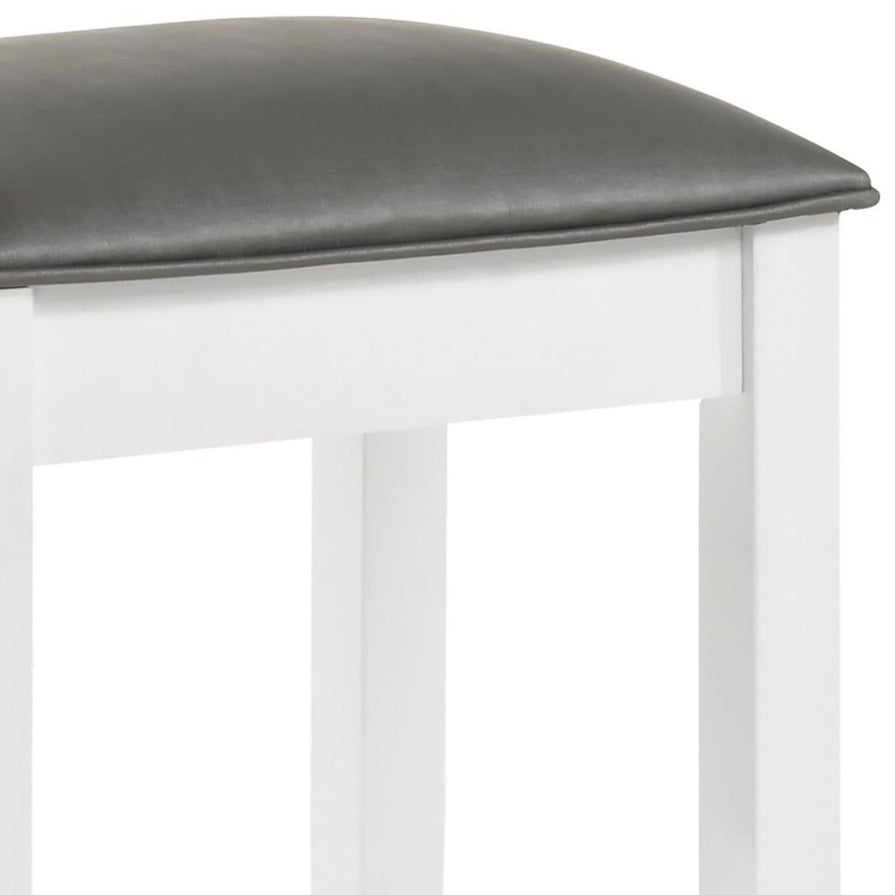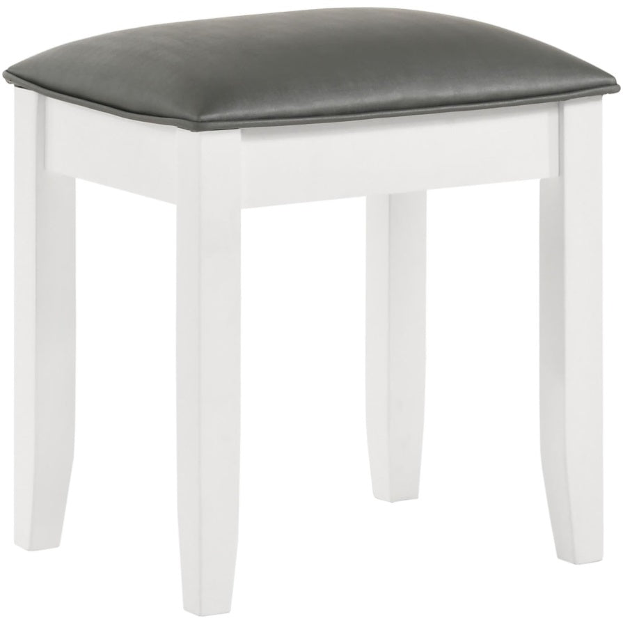 Brilliance and shine accompany a chic glossy white finish coating this updated vanity stool fashioned of quality wood construction with a foam padded seat wrapped in contrasting upholstery. Clean lines induce a modern aesthetic that matches with a variety of vanity designs, adding a comfortable seating venue