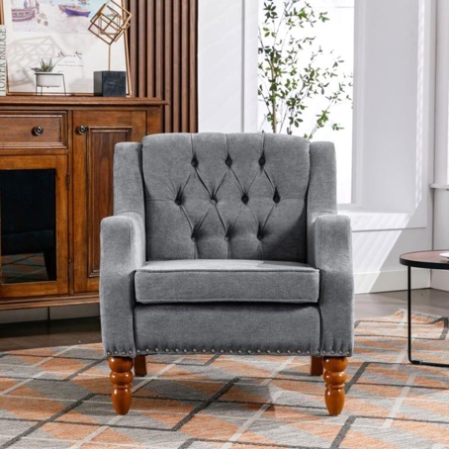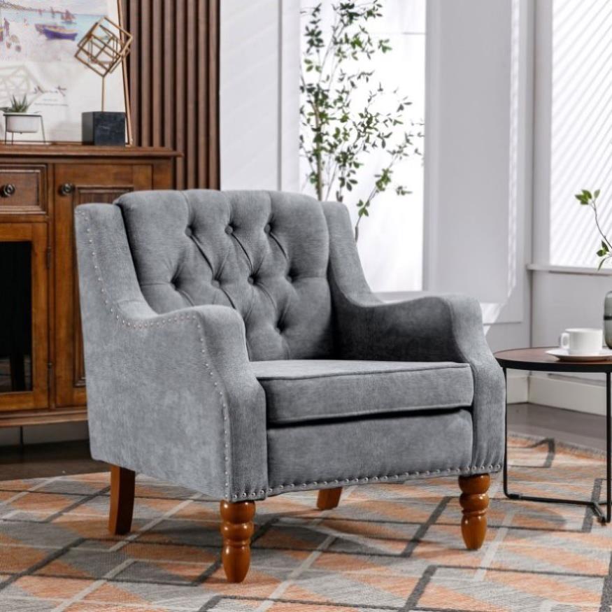 Grey Accent Chair, Living Room Chair, Footrest Chair Set with Vintage Brass Studs, Button Tufted W1170100895