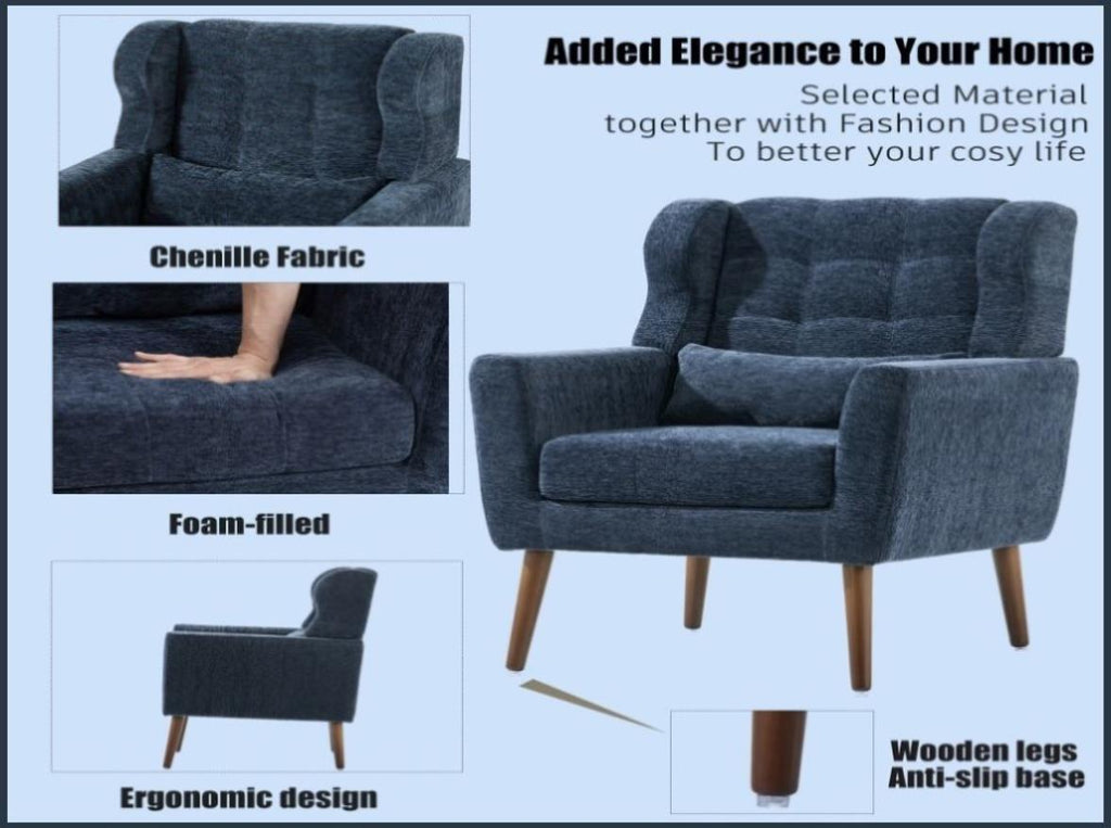 MODERN STYLE:Made of Chenille fabric, this chair's aesthetic appearance design can match the interior decoration system of your home. And our bedroom chair will not be kept out of date for several years. The wood finish is very smooth and soft-touch. Four colors can be selected to add a mid-century style to your room, which is a simple room decoration you can use.
