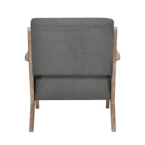 Angled lines intersect to create the modern profile of the Ollen Collection. The rusticated solid wood frame is highlighted with an antique walnut finish. The dark gray fabric upholstery that covers the seat and back of the chair will serve as a complement to your home’s décor. The padded seatback features tufted contouring for added accent.