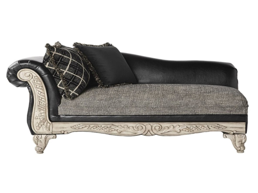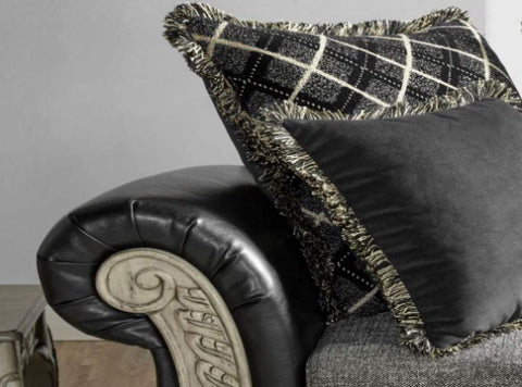 The Classically styled pillow back San Marino Chaise is a beautiful combination of colors and fabrics that will bring warmth to any home. Classic yet casual describes this hand-carved wood collection. Dramatic outer body with durable textured seat cushions, over-sized scatter-back pillows make this a must-have. This sophisticated sofa is covered in a rich ebony bi-cast material and the cushions and seat pillows in a contrasting ebony solid colored fabric and check pattern fabric. The traditional details and carved wood face trim add elegance and grace to your living room.