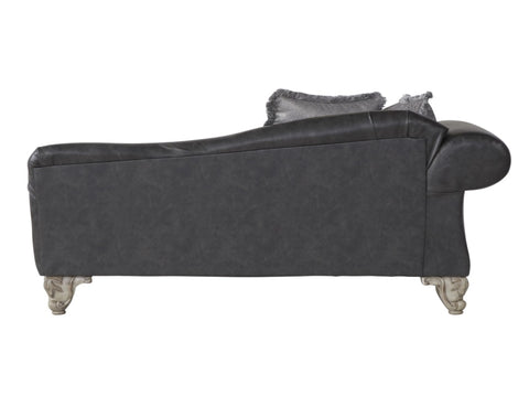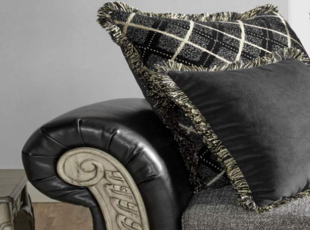 Dramatic outer body with durable textured seat cushions. Covered in a rich ebony faux leather material paired with gray fabric seat cushion and patterned back pillows