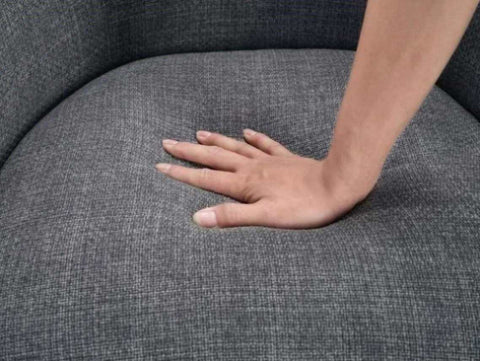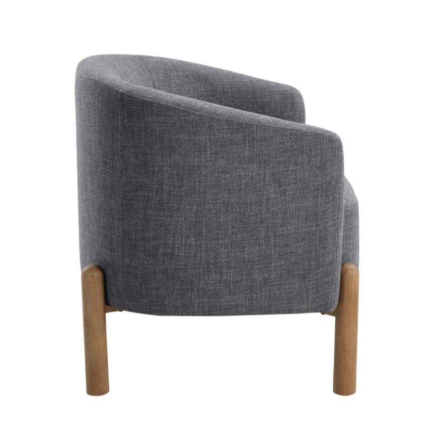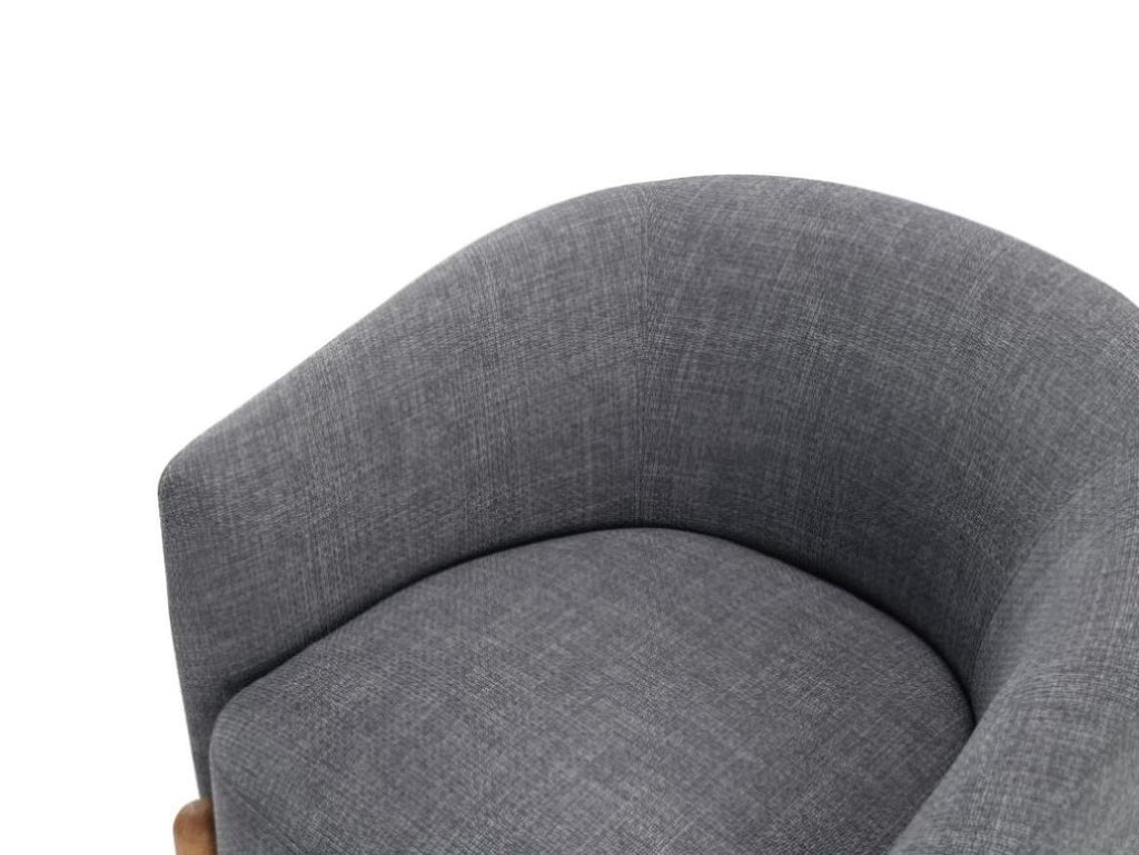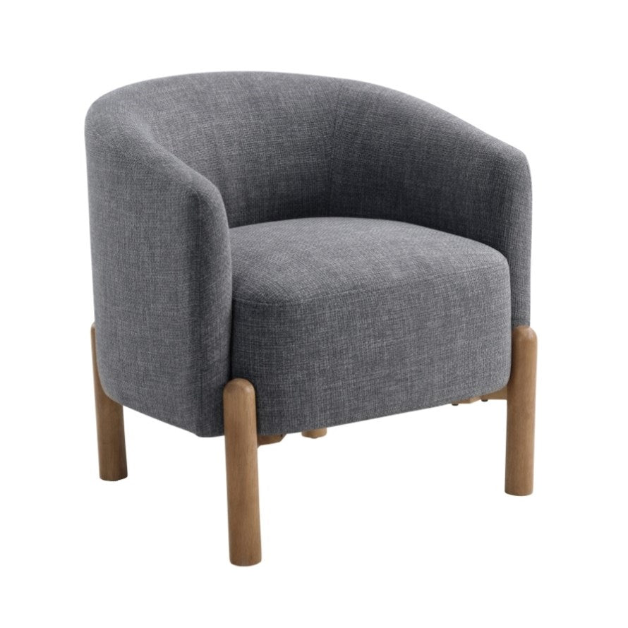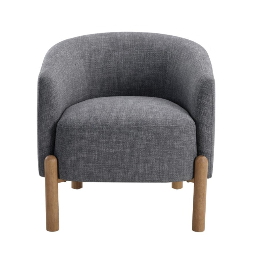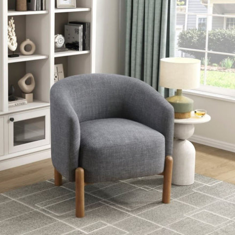 Upgrade your living space with this contemporary gray fabric barrel chair, designed for both style and comfort. Featuring a durable plywood frame and foam padding over pocket coils, this chair provides exceptional support and a luxurious seating experience. The textured gray fabric upholstery adds a touch of modern sophistication, while the attached back and seat cushions offer a clean, tailored look. The solid wood legs in a light brown finish provide a warm and stylish foundation, complementing any décor. With a 300lb weight capacity and easy assembly, this chair is perfect for adding a cozy and elegant touch to your living room, bedroom, or reading nook. PRODUCT DIMENSIONS: Overall Dimension: 27.5" x 26" x 29"H Seat Width: 20.5" Seat Depth: 20" Seat Height: 19" Arm width: 3.5" Arm height: 23.5" Leg Height: 12" Listing Includes: One Accent Chair Only. End-table: not included. Simple Assembly Require