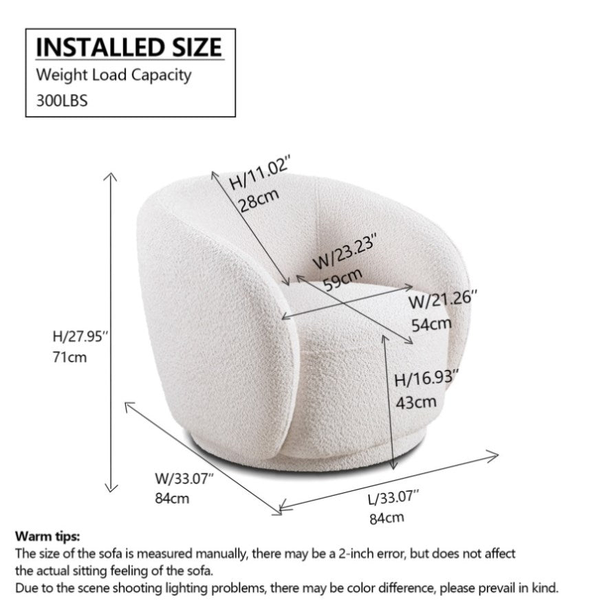 No Assembly and Easy Cleaning: This barrel accent chair is without any assembly and easy to clean, easy to maintain and care for, making it suitable for households.. Swivel armchair overall size: 33.07"W x 33.07"D x 27.95"H. Weight Capacity: 300lbs.