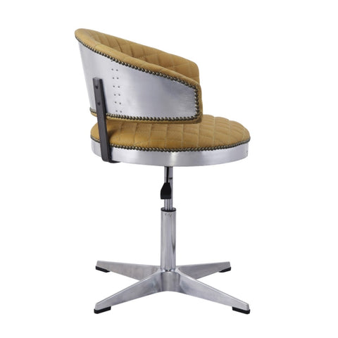 This stool features a metal frame with a 4-star base equipped with casters in a polished chrome finish, ensuring stability and mobility. Upholstered in turmeric top grain leather, its soft round padded seat and uniquely designed bucket-shaped backrest offer excellent support and comfort, while allowing easy rotation for convenience.