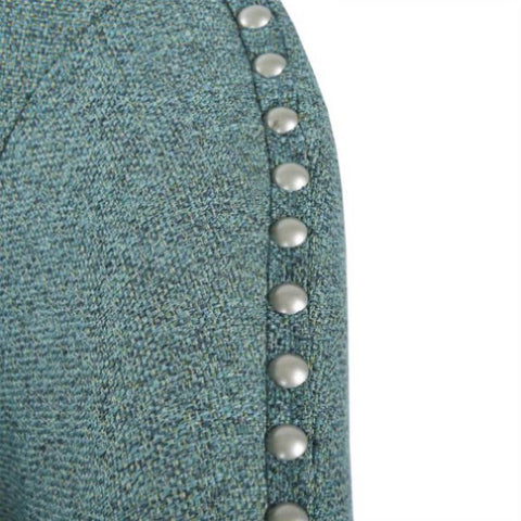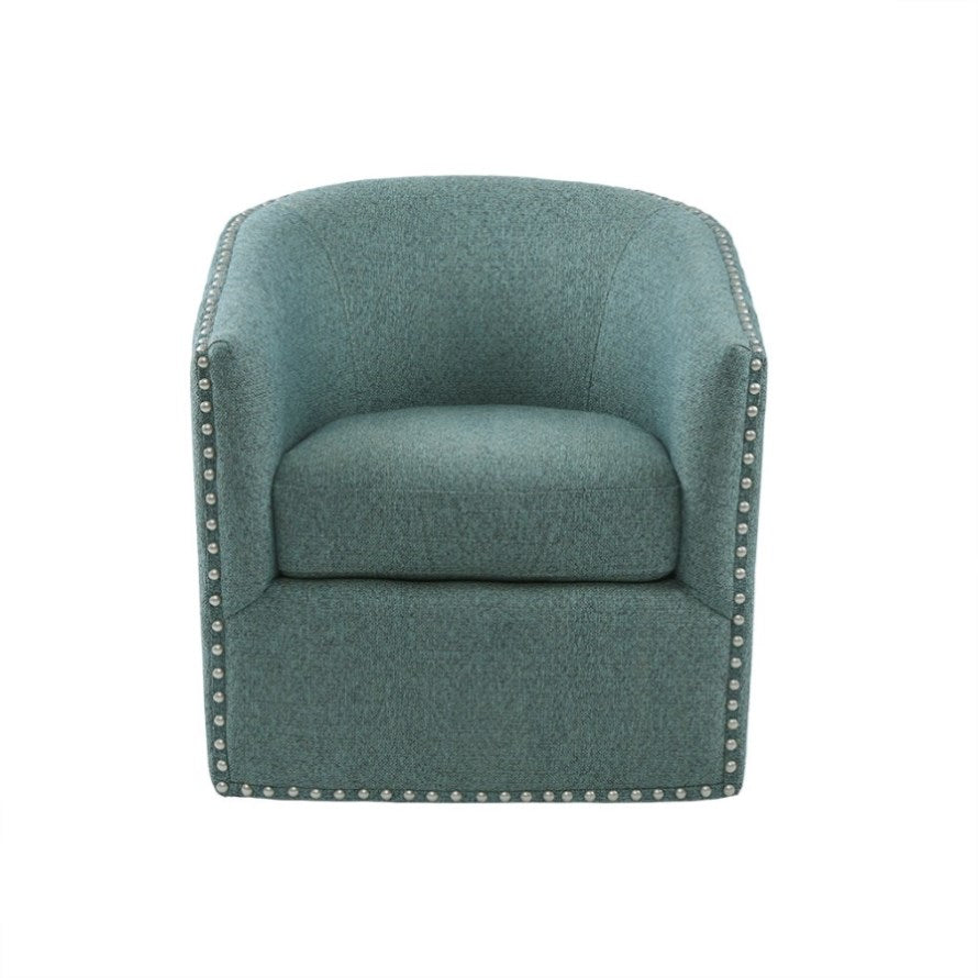 Relax in style with the Tyler Swivel Chair. The curved design and high-density foam cushion creates a deep and comfortable seat allowing for instant relaxation. Pewter Nail heads line the arms and back adding charm and style to the lounge chair. The swivel feature allows the lounge chair to rotate on its black metal base. Upholstered in a vivid teal fabric with indigo and gold accent colors, this swivel chair fits in any room of your home. No assembly required.