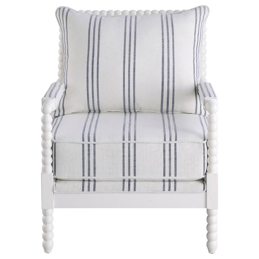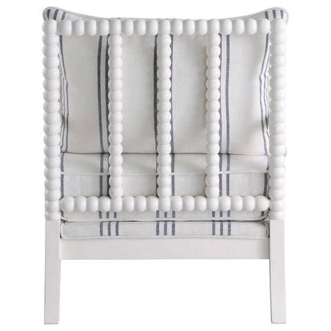 Nautical vibes stand out in the accent chair, featuring a stark white frame and linen-like cushions with navy striped accents. Ideal for coastal style homes and cottages, this accent chair features a charming stacked-sphere spindle design along the padded arms, front feet and backrest, offering a unique visual interest.
