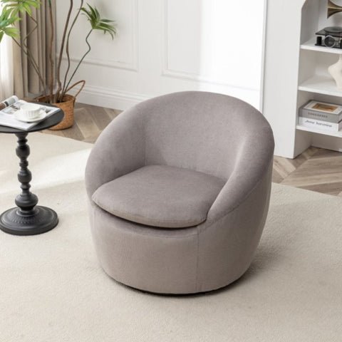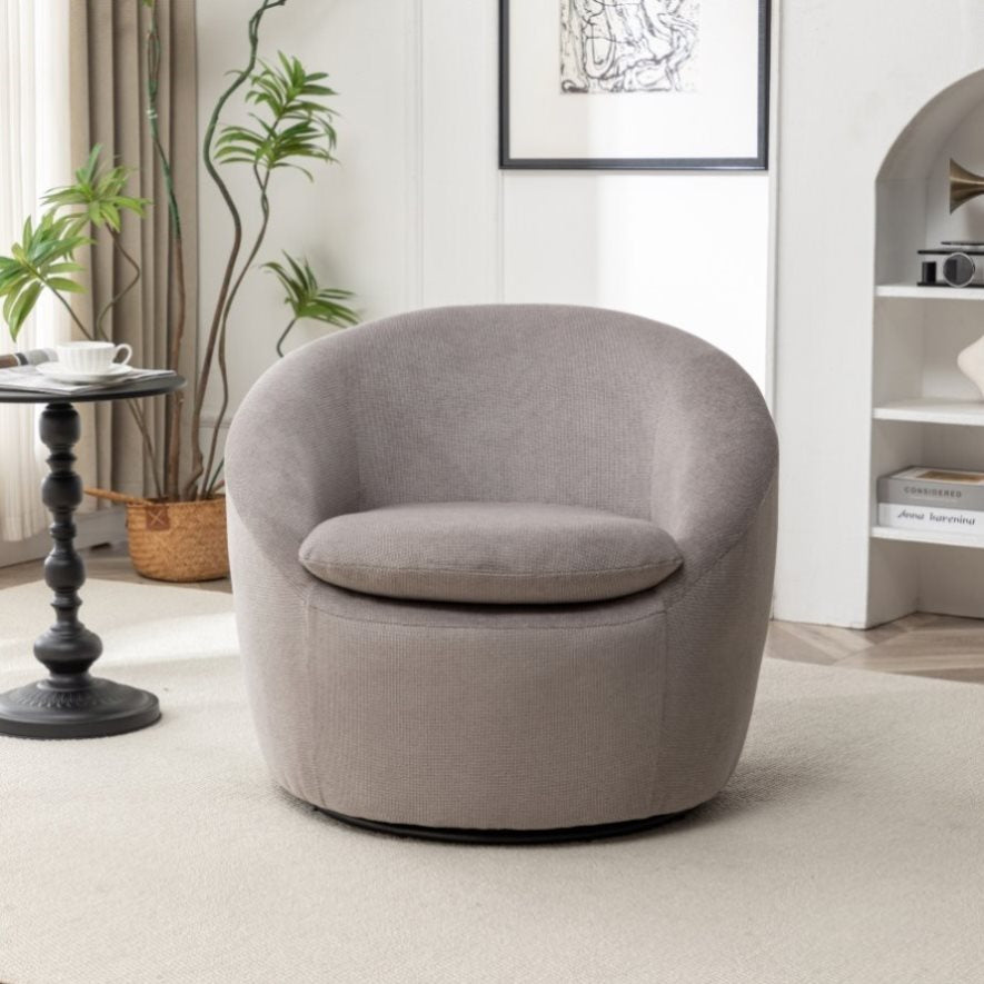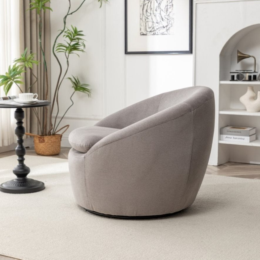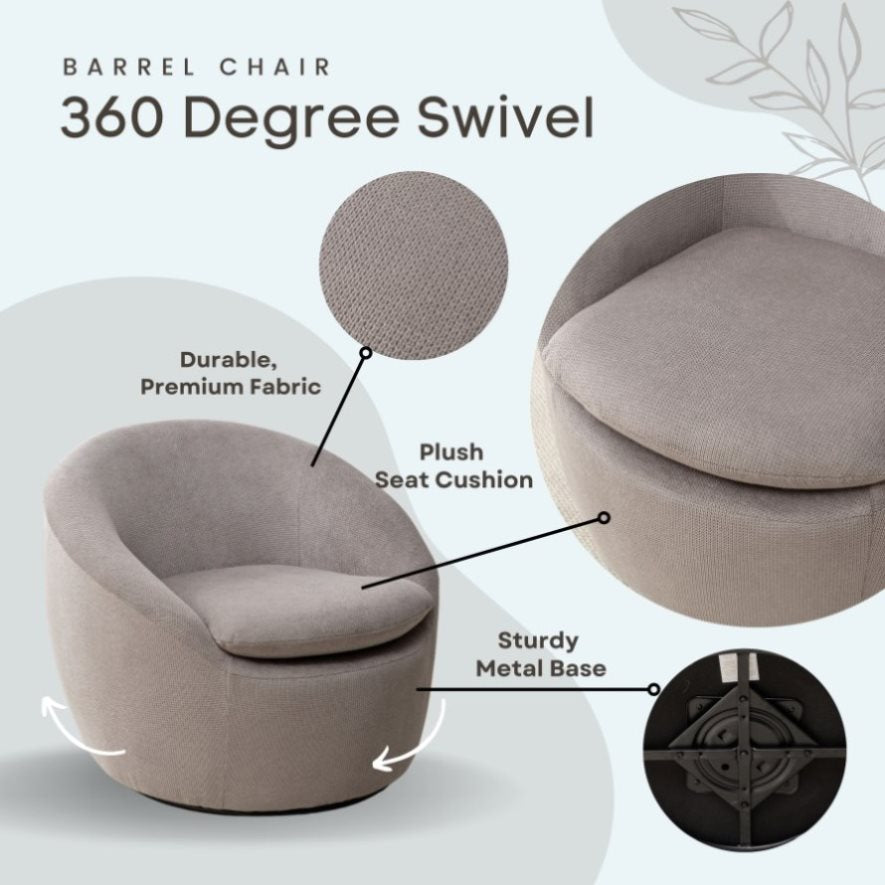 The HZFurniture Winnie 360° Swivel Barrel Chair is both chic and comfortable, making it a suitable seating option for various settings. With its wide, rounded design, it adds style and comfort to your living space. Built to last, this armchair features a round metal base for support and a 360° swivel. Its construction includes fine fabric and high-density sponges, ensuring enhanced support and unmatched coziness. The well-padded armrests and rounded back offer hours of relaxation and serve as a focal point.