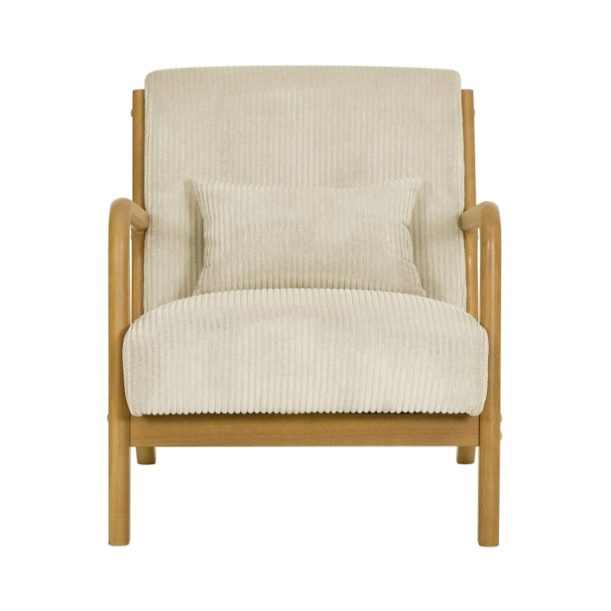 The seat and backrest are upholstered in plush, ribbed corduroy fabric in a soft tone, adding both texture and coziness.