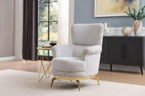 Add a touch of elegance to your space with this refined accent chair, crafted for both style and comfort. Upholstered in soft cut chenille polyester, available in gray or cream, this chair brings a cozy texture and timeless appeal to any room. The chair's high back and gently curved armrests create a supportive seating experience, while the gold-accented legs add a hint of luxury, perfectly complementing the fabric’s subtle tones. Ideal for living rooms, bedrooms, or sophisticated lounge areas, this chair combines form and function for a sophisticated seating solution.