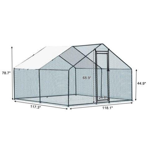Elevate your backyard farm setup with our expansive 10 x 10 ft Large Metal Chicken Coop. This walk-in poultry cage is designed to provide ample space for your chickens, rabbits, cats, dogs, or other farm animals to roam and play freely. Crafted with meticulous attention to durability and safety, this coop ensures a secure and comfortable environment for your animals. A waterproof cover shields your poultry from adverse weather, while the robust construction guarantees longevity and ease of maintenance. Ideal for outdoor settings, this chicken coop is an essential addition to any backyard farm or garden, offering a blend of functionality, protection, and spaciousness.