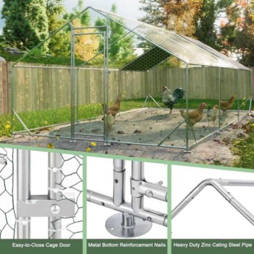 Our chicken run manufactured with high quality steel frame, including ground nails, so that the fence can better fixed to the ground.solid enough to keep the poultry from escaping and secure from predators. And this hen run house is also stably stationed to withstand the wind and snow weather. Featuring a durable sun and rain-proof tarp on the top, it is protective for the steel frame, wire mesh and animals under its cover. And the tarp is sturdy enough to avoid tear up or fade over time. With hexagonal wire mesh and the small gaps between meshes, you can prevent your chicken from some predators to make them safety. The spring clasp design requires no-welding for your quick assembly with this large metal chicken run. You can easily understand the installation with a complete set of components and simple instructions we offered. Lockable chicken run house suitable for a variety of animals like for chickens, rabbits, ducks and more.This walk-in metal poultry house has a spacious area for the animal to play and rest in the backyard garden and farm settings.