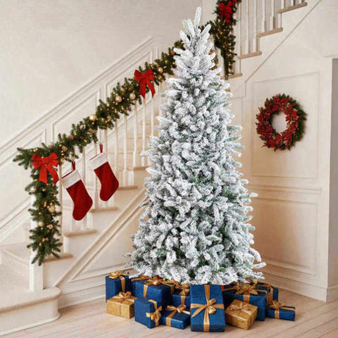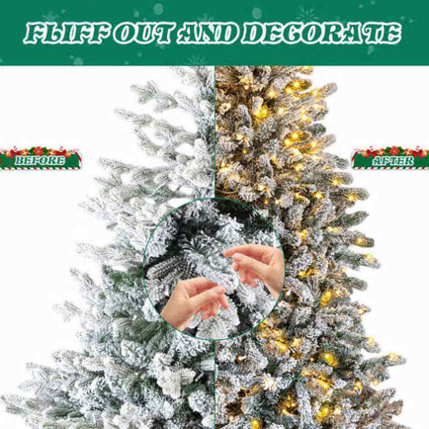 1. Snow-Flocked Charm: With meticulously crafted branch tips dusted in a delicate snow flocking, this tree creates an enchanting winter wonderland right in your home. The realistic snow-kissed branches provide the perfect canvas for your holiday ornaments, transforming your space into a cozy, festive retreat.