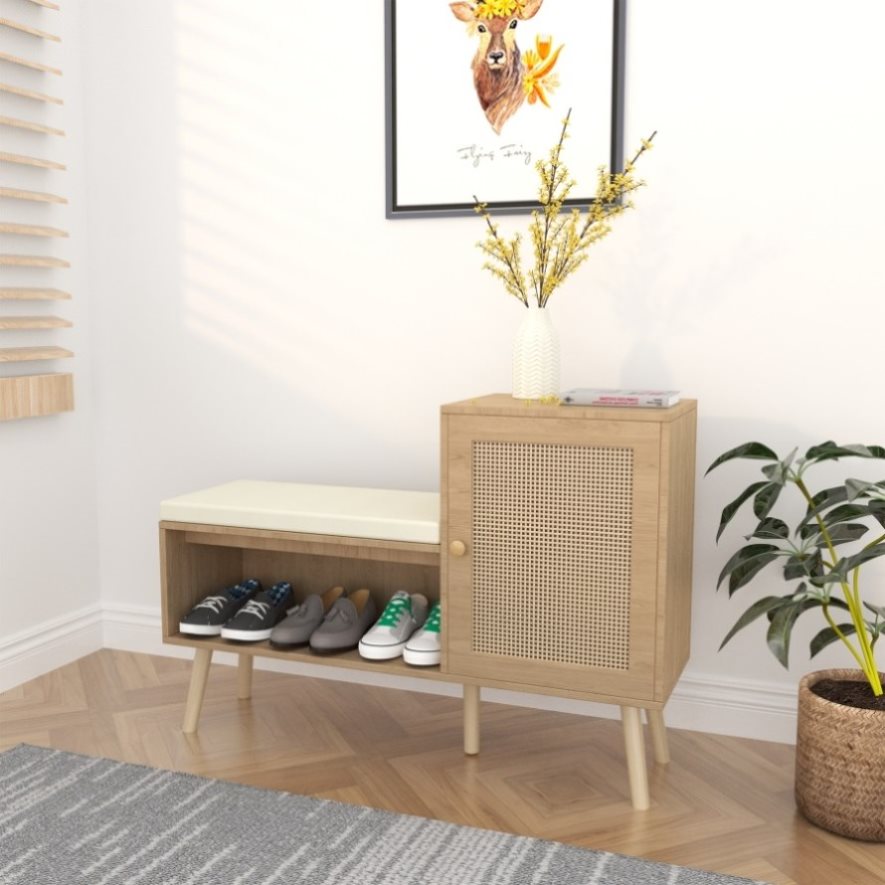 Multifunctional Shoe Cabinet and BenchMaximize Your Space: Featuring a spacious 3-tier shoe cabinet, a 2-tier shoe bench, and a top platform, this bench allows you to neatly store various shoes and keep your entryway clutter-free. The cabinet doors with delicate faux rattan accents add a touch of natural elegance to your decor.