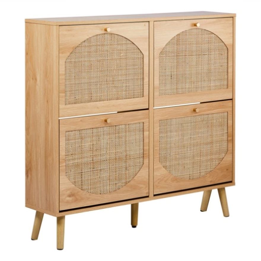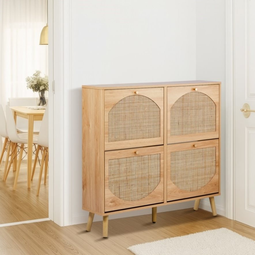 Upgrade your entryway with this stylish and functional 2-tier flip-down shoe cabinet featuring a natural rattan arched front and elegant high legs. Crafted from durable MDF with melamine laminate, this 105x24x98cm (WxDxH) shoe organizer offers 8 spacious compartments to neatly store 12-16 pairs of shoes while enhancing your home's aesthetic. The warm wood tone blends seamlessly with various decor styles, from modern to rustic. Its space-saving slim design (24cm depth) fits perfectly in narrow hallways or small apartments. With a 28kg load capacity, this sturdy yet lightweight shoe cabinet combines smart storage solutions with charming design elements for everyday convenience.