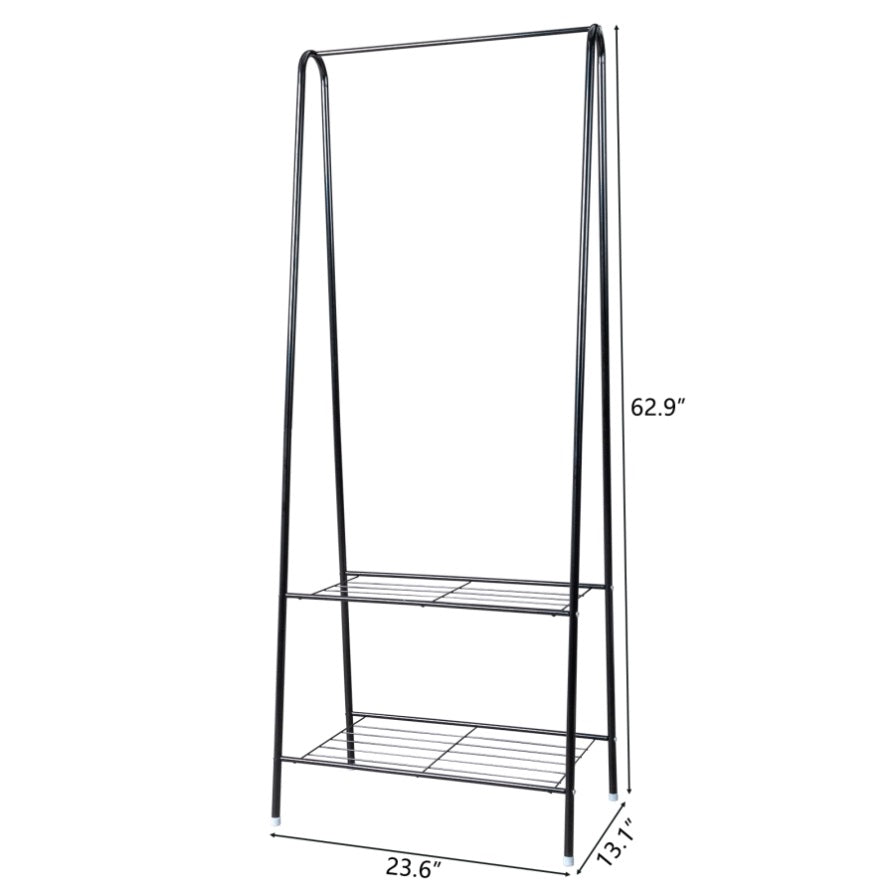 2. SPACIOUS AND STABLE 2-TIER CLOTHING RACK:1 top rod can well hang garment,coats and dresses.And the 2 tiers of metal shelves can store quilt,shoes,folded clothes,storage box etc