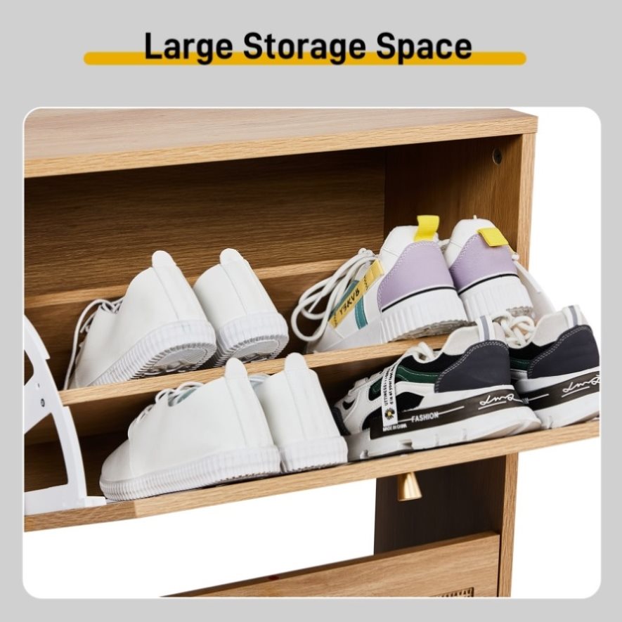 The two convenient flip-up doors open smoothly to reveal spacious compartments, allowing quick access to frequently worn shoes while maintaining a clutter-free appearance when closed. -