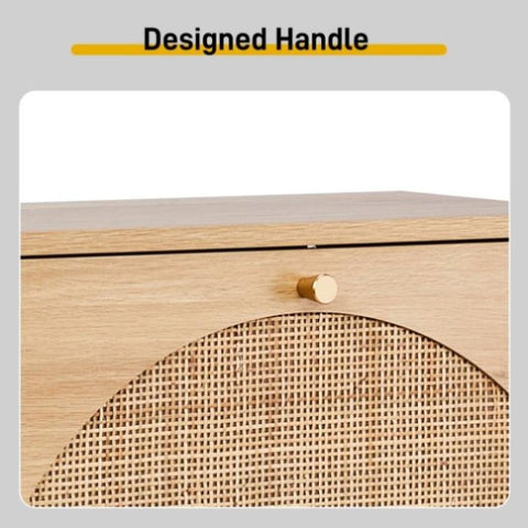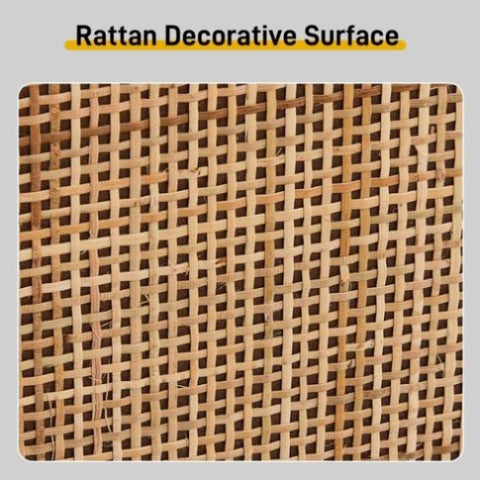 The arched rattan panel doors add natural texture and breathability, while the melamine-coated wood finish ensures scratch-resistant durability and easy cleaning. -