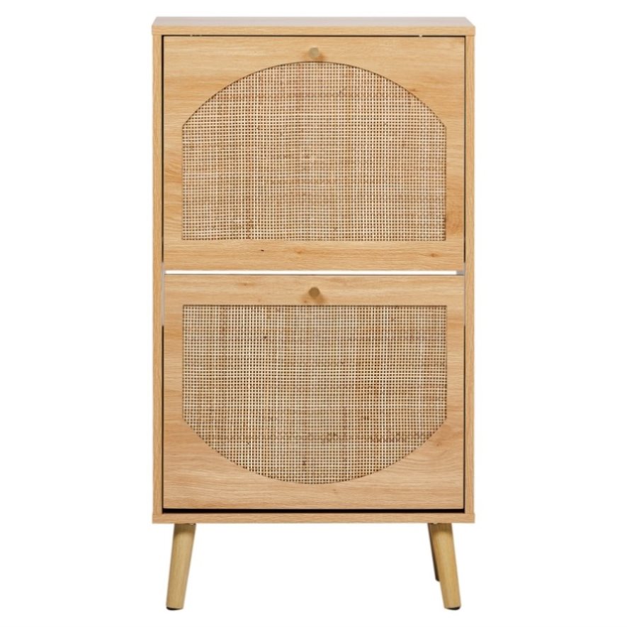 Upgrade your entryway with this stylish and functional Flip-Door Shoe Cabinet featuring elegant arched rattan fronts. Crafted from high-density fiberboard with melamine laminate, this 54x24x98cm shoe cabinet combines durability with a warm natural wood finish. The two flip-up compartments provide easy access to footwear while keeping them neatly organized. Its tall arched legs add a mid-century modern touch, elevating it off the floor for easy cleaning. Perfect for small spaces, this slim yet spacious shoe cabinet blends seamlessly with any decor while offering practical storage for 8-12 pairs of shoes.