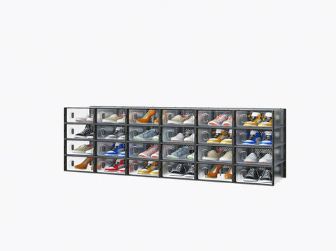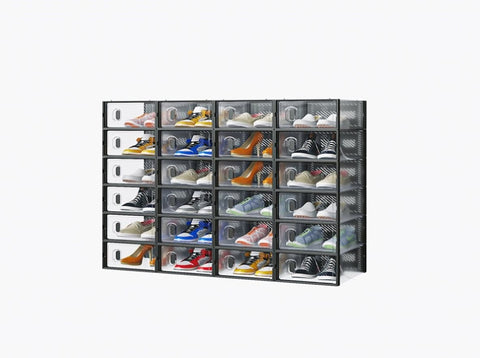 Revolutionize your storage with this 24-Piece Plastic Mesh Shoe Box Set, the ultimate solution for organizing shoes, accessories, and more. Designed for versatility and space efficiency, these sleek black boxes are perfect for homes, dorms, or any space in need of order.