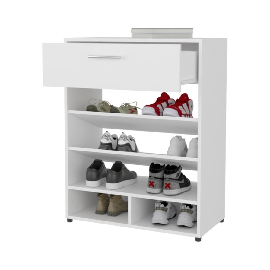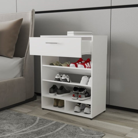 "Stylish and functional shoe rack featuring multiple open shelves for organized storage and a spacious top drawer for additional storage needs. Its sleek and modern design, combined with durable construction, makes it an ideal addition to entryways, bedrooms, or closets, blending seamlessly with any home décor. Materials: Particle board and Melamine Dimensions: 35,4"" (H) x 27,6"" (W) x 13,9"" (D)."""